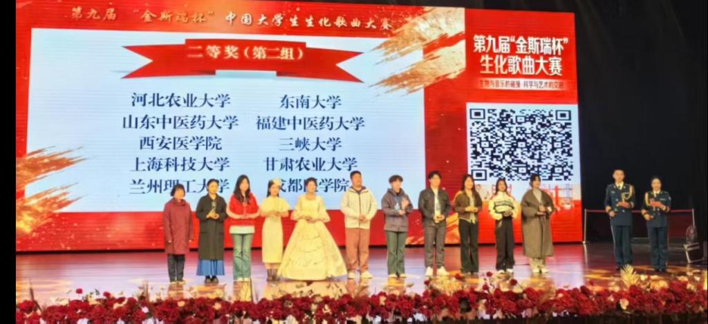 近日,第九届“金斯瑞杯”中国大学生生化歌曲大赛在空军军医大学圆满落幕。由我校生物科学与技术学院教师马丽萍、王丹和罗勤指导,2023级生物制药和生物技术专业李馨怡、余艳妮、代垚辉、李玟和袁彩霞5位同学创作演绎的生化歌曲《苯丙浊浪里的啼哭》在全国总决赛中荣获二等奖。