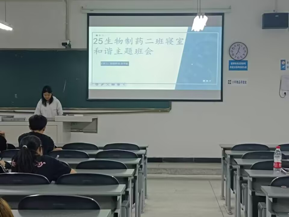 为营造安全、文明、和谐、温馨的集体生活环境,增强班级凝聚力,10月14日,生物科学与技术学院2025级生物制药2班精心组织了一场别开生面的“寝室和谐”主题班会。本次活动由阿苏阿衣和孙宇航同学共同主持,陆远雪同学负责现场记录与拍摄,全班同学踊跃参与,共同为构建美好的寝室生活建言献策。